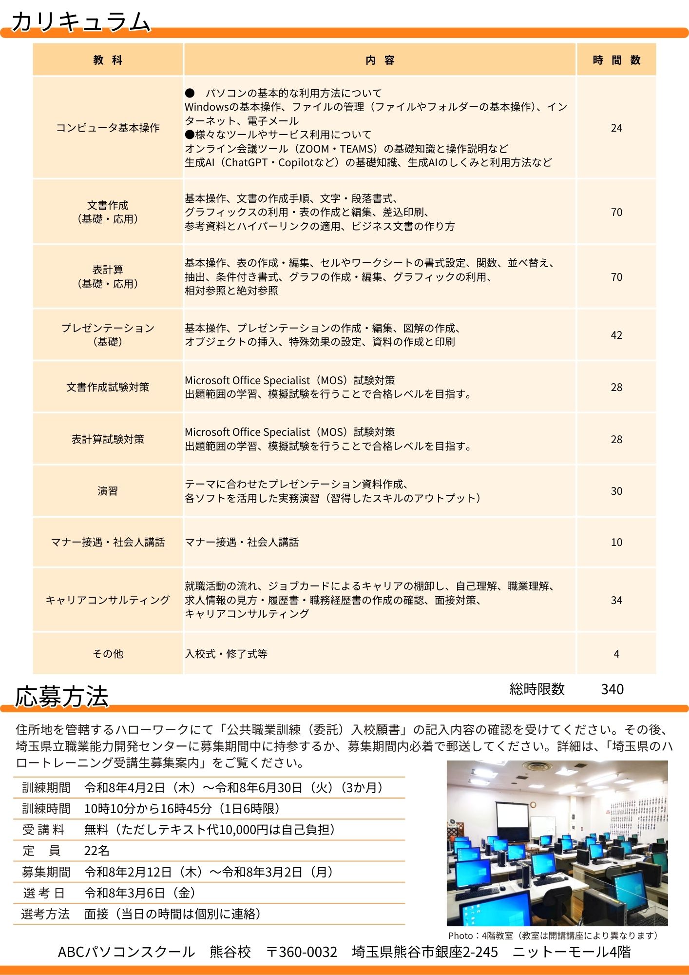 | 訓練内容 | コンピュータ基本操作(Windows 11) オンライン会議ツールと生成AIの基礎知識と操作方法 文書作成(基礎・応用) 表計算(基礎・応用) プレゼンテーション(基礎) Web制作(基礎 HTML&CSS) 演習 |